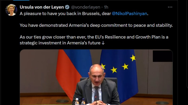 Il presidente della Commissione Europea Ursula von der Leyen, all’arrivo del primo ministro armeno Nikol Pashinyan a Bruxelles, ha sottolineato su X i crescenti legami tra Ue e Armenia. «È un piacere averti di nuovo a Bruxelles, caro Nikol Pashinyan», ha scritto. «Hai dimostrato il profondo impegno dell’Armenia per la pace e la stabilità». Ha poi aggiunto: «Mentre i nostri legami si rafforzano più che mai, il Piano di Resilienza e Crescita dell’Ue è un investimento strategico nel futuro dell’Armenia».