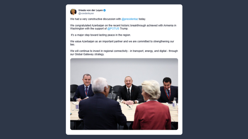 Il presidente della Commissione Europea, Ursula von der Leyen, ha comunicato su X il «confronto molto costruttivo» con il presidente dell’Azerbaigian Ilham Aliyev. «Ci siamo congratulati con l’Azerbaigian per il recente e storico passo avanti raggiunto con l’Armenia a Washington, grazie al sostegno del presidente degli Stati Uniti Donald Trump. Si tratta di un progresso significativo verso una pace duratura nella regione». L’Europa, spiega la von der Leyen, continuerà a «investire nella connettività regionale – nei settori dei trasporti, dell’energia e del digitale – attraverso la nostra strategia Global Gateway».