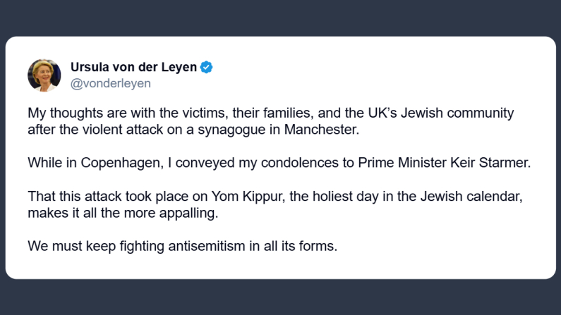 Il presidente della Commissione Europea, Ursula von der Leyen, esprime cordoglio per l’attentato alla sinagoga di Manchester dicendo su X:
