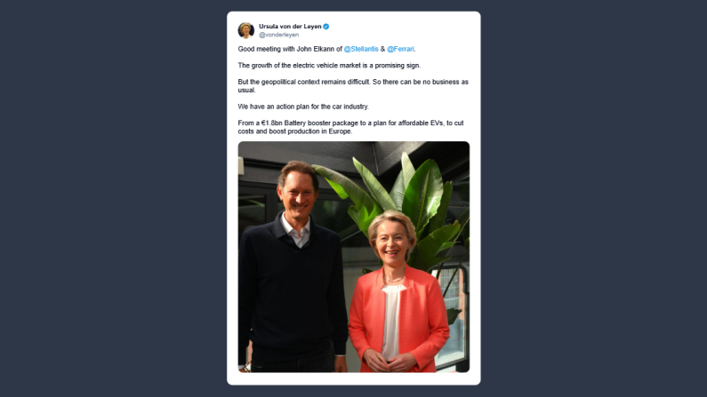 La presidente della Commissione Europea, Ursula von der Leyen, ha scritto su X: «Incontro positivo con John Elkann di Stellantis e Ferrari. La crescita del mercato dei veicoli elettrici è un segnale incoraggiante. Tuttavia, il contesto geopolitico rimane complesso, quindi non si può procedere come se nulla fosse. Abbiamo un piano d’azione per l’industria automobilistica. Da un pacchetto da 1,8 miliardi di euro per potenziare la produzione di batterie a un programma per veicoli elettrici accessibili, con l’obiettivo di ridurre i costi e incrementare la produzione in Europa».