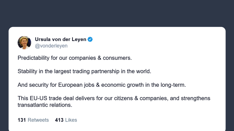 Il presidente della Commissione Europea, Ursula von der Leyen, ha anunciato su X che l’accordo tra Ue e Stati Uniti a Turnberry, in Scozia, offrirà «benefici ai cittadini e alle imprese, rafforzando le relazioni transatlantiche». Oltre a offrire «prevedibilità per le aziende e per i nostri consumatori» dice la von der Leyen, porterà sicurezza per i «posti di lavoro europei e una crescita economica a lungo termine».
