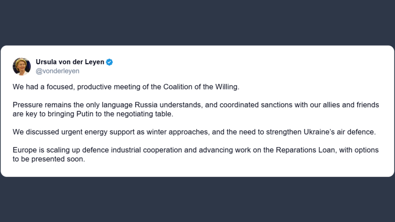 Il presidente della Commissione europea, Ursula von der Leyen, ha scritto ieri su X: «abbiamo tenuto una riunione mirata e produttiva della Coalizione dei volenterosi. La pressione è l’unico linguaggio che la Russia comprende, e le sanzioni coordinate con i nostri alleati e amici sono fondamentali per portare Vladimir Putin al tavolo dei negoziati. Abbiamo discusso del sostegno energetico urgente con l’avvicinarsi dell’inverno e della necessità di rafforzare la difesa aerea dell’Ucraina. L’Europa sta intensificando la cooperazione industriale nel settore della difesa e portando avanti il lavoro sul prestito per le riparazioni, con opzioni che saranno presentate a breve».