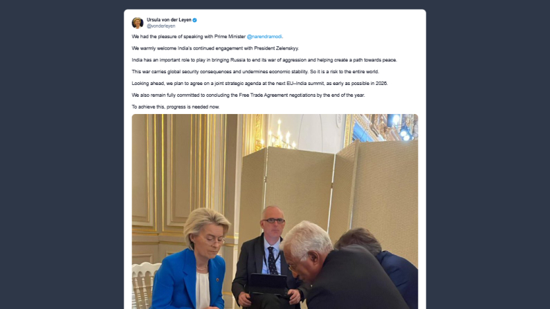 Il presidente della Commissione Europea, Ursula von der Leyen, ha annunciato su X il colloquio con il primo ministro indiano Narendra Modi. «Accogliamo con favore il continuo impegno dell’India con il presidente Volodymyr Zelensky». L’India, precisa la von der Leyen, avrebbe un ruolo importante nel «convincere la Russia a porre fine alla sua guerra di aggressione e nel favorire un percorso verso la pace». Una guerra che, per il presidente, ha conseguenze sulla sicurezza mondiale e compromette la stabilità economica, rappresentando un «rischio» per l’intero pianeta. Guardando al futuro, si prevede di concordare un programma finalizzato a tenere un vertice Ue-India, previsto «il prima possibile» nel 2026. «Ci impegniamo a concludere i negoziati per l’Accordo di Libero Scambio entro la fine dell’anno. Per raggiungere questo obiettivo, sono necessari progressi immediati».