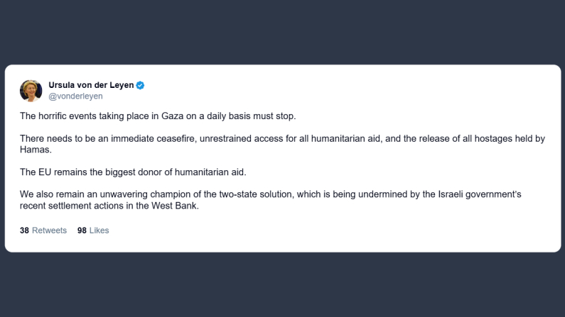 Il presidente della Commissione Europea, Ursula von der Leyen, ha evidenziato su X che gli «orribili eventi che si verificano quotidianamente a Gaza devono cessare. È necessario un cessate il fuoco immediato, un accesso illimitato per tutti gli aiuti umanitari e la liberazione di tutti gli ostaggi detenuti da Hamas». L’Ue – prosegue la von der Leyen – è il «principale donatore di aiuti umanitari» e continuerà al contempo a sostenere fermamente la «soluzione a due Stati, che viene compromessa dalle recenti azioni di insediamento del governo israeliano in Cisgiordania».