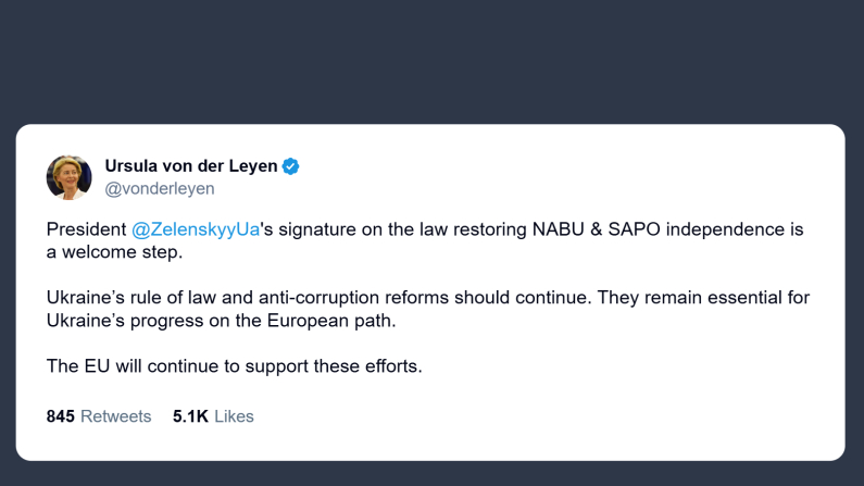 Il presidente della Commissione Europea, Ursula von der Leyen, ha commentato su X la firma del presidente ucraino Zelensky in merito alla legge finalizzata a ripristinare l’indipendenza dell’Ufficio Nazionale Anticorruzione in Ucraina. «Un passo positivo», ha affermato la von der Leyen, sottolineando che le riforme sullo stato di diritto e contro la «corruzione» devono proseguire, essendo «essenziali per il progresso dell’Ucraina verso il percorso europeo», e confermando il sostegno continuo dell’Ue a questi sforzi.