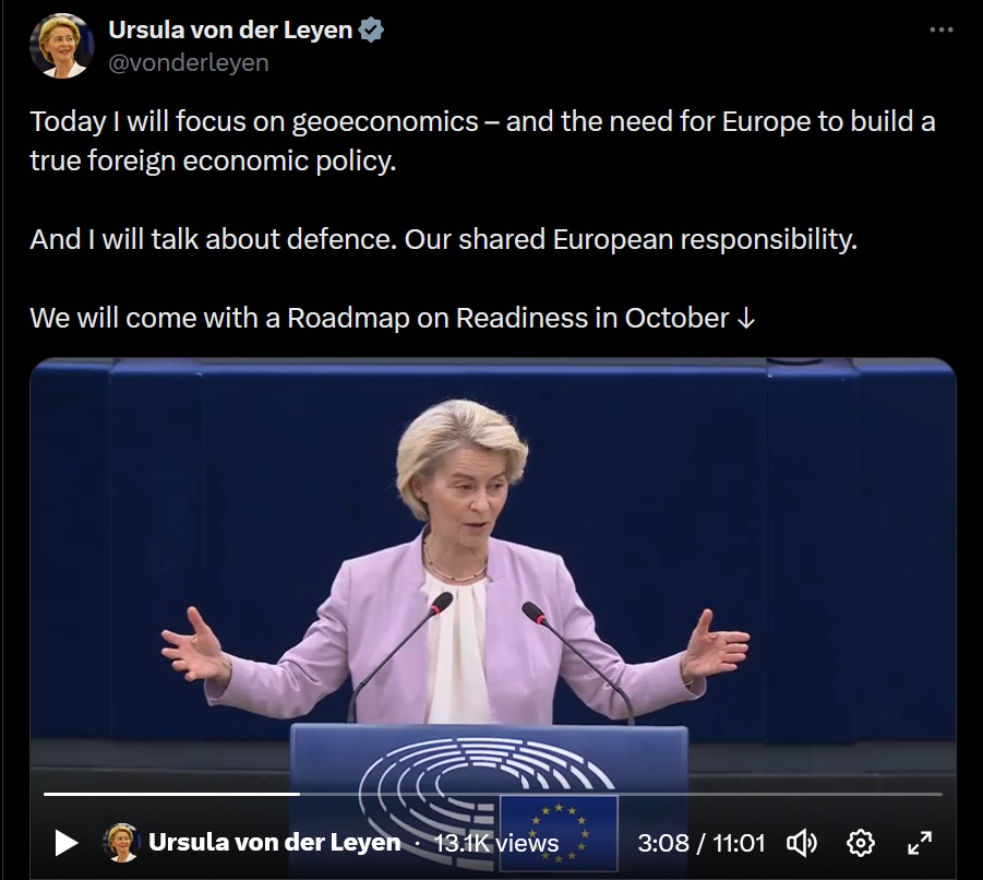 La presidente della Commissione Europea, Ursula von der Leyen, ha annunciato oggi su X di concentrarsi principalmente «Sulla geoeconomia e sulla necessità per l’Europa di costruire una vera politica economica estera. E parlerò di difesa». Von der Leyen ha anche anticipato la presentazione di una “Roadmap sulla prontezza” prevista per ottobre, un piano che promette di delineare strategie concrete per affrontare le sfide economiche e di sicurezza che il continente deve fronteggiare.
