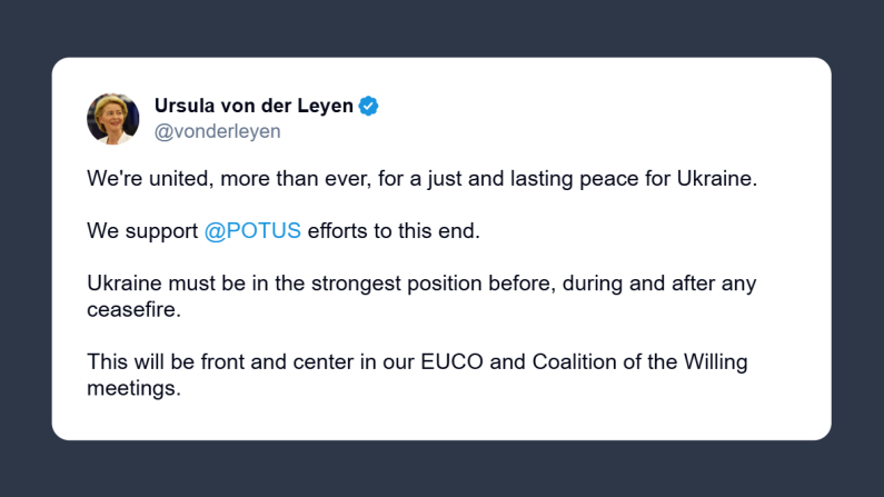 Il presidente della Commissione europea, Ursula von der Leyen, ha scritto su X: «siamo più uniti che mai per una pace giusta e duratura per l’Ucraina. Sosteniamo gli sforzi del presidente degli Stati Uniti Donald Trump a tal fine». La Von der Leyen ha poi evidenziato che «l’Ucraina deve essere nella posizione più solida possibile prima, durante e dopo qualsiasi cessate il fuoco. Questo sarà al centro dei nostri incontri al Consiglio europeo e nella Coalizione dei Volenterosi».