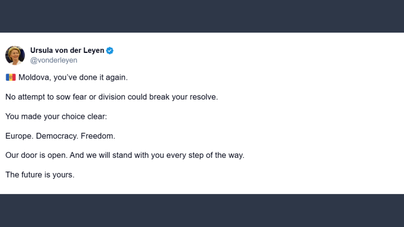 Il presidente della Commissione europea, Ursula von der Leyen, ha commentato su X le elezioni moldave vinte da un partito europeista. «Moldavia, ce l’hai fatta ancora», ha dichiarato la von der Leyen. «Nessun tentativo di seminare paura o divisioni ha potuto piegare la tua determinazione, hai espresso chiaramente la tua scelta: Europa, democrazia e libertà».