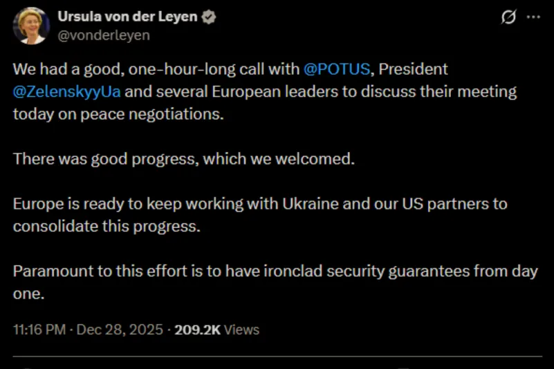 Il presidente della Commissione europea Ursula von der Leyen ha scritto su X: «abbiamo avuto una bella telefonata di un’ora con il presidente Donald Trump e il presidente Volodymyr Zelenskyy e diversi leader europei per discutere del loro incontro odierno sui negoziati di pace. Sono stati registrati progressi significativi, che abbiamo accolto con favore. L’Europa è pronta a continuare a collaborare con l’Ucraina e i nostri partner statunitensi per consolidare questi progressi. Fondamentale per questo sforzo è avere garanzie di sicurezza incondizionate fin dal primo giorno».