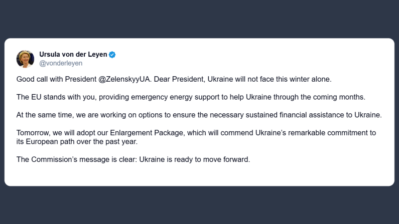Il presidente della Commissione europea, Ursula von der Leyen, ha scritto ieri su X: «Ottima telefonata con il presidente Zelensky. Caro presidente, l’Ucraina non affronterà questo inverno da sola. L’Unione europea è al suo fianco e fornisce aiuti energetici d’emergenza per superare i prossimi mesi. Nel contempo lavora a soluzioni per garantire il sostegno finanziario necessario e continuativo all’Ucraina. Domani adotteremo l’Enlargement Package, che riconoscerà l’impegno straordinario dell’Ucraina sul proprio percorso europeo nell’ultimo anno. Il messaggio della Commissione è chiaro: l’Ucraina è pronta ad andare avanti».