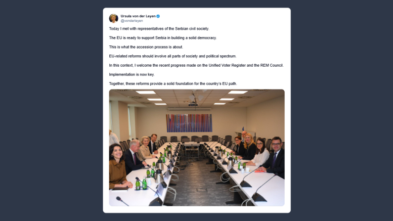 Il presidente della Commissione Europea, Ursula von der Leyen, ha scritto su X: «Oggi ho incontrato i rappresentanti della società civile serba. L’Ue è pronta a sostenere la Serbia nella costruzione di una democrazia solida. Questo è l’obiettivo del processo di adesione. Le riforme legate all’Ue devono coinvolgere tutte le componenti della società e l’intero spettro politico. In questo contesto, accolgo con favore i recenti progressi compiuti sul Registro unificato degli elettori e sul Consiglio del Rem. L’attuazione è ora fondamentale. Insieme, queste riforme costituiscono una base solida per il percorso della Serbia verso l’Unione Europea».