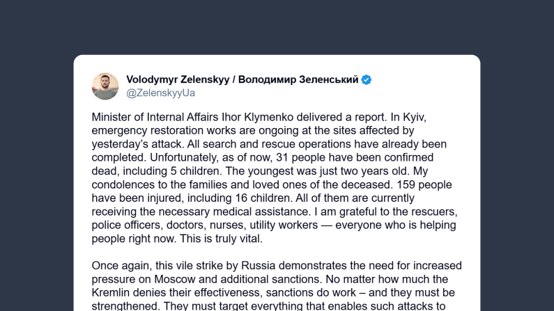 Il presidente ucraino Volodymyr Zelensky ha riportando il bilancio di un recente attacco russo a Kiev su X: 31 morti, tra cui 5 bambini, il più piccolo di due anni, e 159 feriti, tra cui 16 minori. Il presidente ucraino ha denunciato l’attacco come prova della necessità di aumentare la pressione su Mosca con «sanzioni più severe» che, dice Zelensky, «funzionano, nonostante le smentite del Cremlino». Ha poi citato il sostegno del presidente americano Donald Trump e dei presidenti europei, sottolineando che solo un’azione congiunta può fermare l’aggressione russa, che in luglio ha utilizzato oltre 5 mila 100 bombe, 3 mila 800 droni “Shahed” e 260 missili. «Ogni impegno conta. Ogni giorno conta», ha concluso.