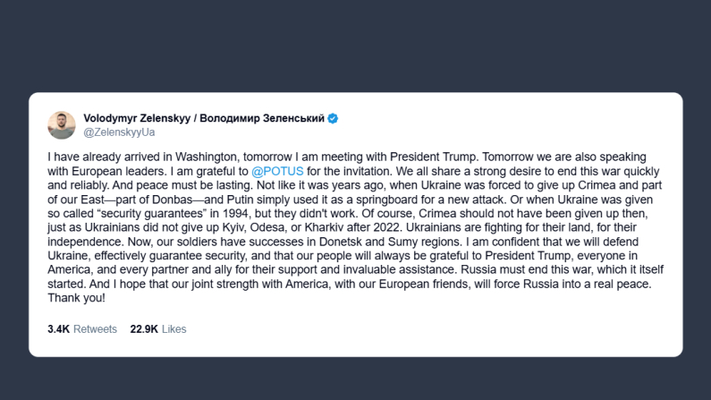 «Sono arrivato a Washington», scrive in un post su X il presidente ucraino Volodymyr Zelensky. «Incontrerò il presidente Donald Trump e i presidenti europei. Ringrazio il presidente Trump per l’invito». Zelensky ha poi evidenziato come tutti condividano il «forte desiderio di porre fine a questa guerra» il prima possibile.