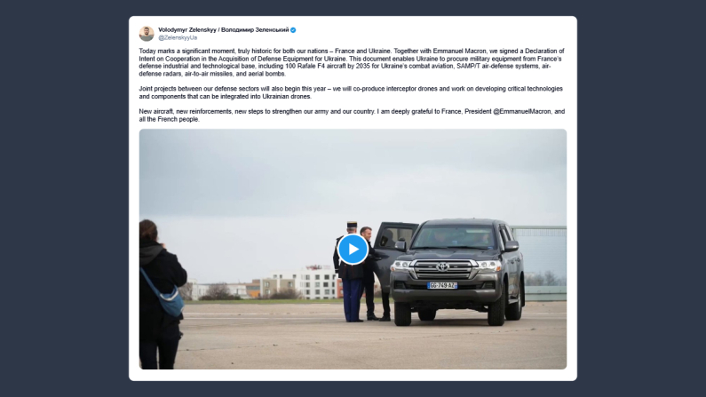 Il presidente ucraino Volodymyr Zelensky ha scritto su X: «oggi è un momento davvero storico per Francia e Ucraina. Insieme a Emmanuel Macron abbiamo firmato una dichiarazione d’intenti sulla cooperazione per l’acquisizione di equipaggiamenti per la difesa dell’Ucraina. Il documento consente all’Ucraina di procurarsi armamenti dalla base industriale e tecnologica della difesa francese, inclusi 100 caccia Rafale F4 entro il 2035 per l’aviazione da combattimento ucraina, sistemi antiaerei Samp/T, radar di difesa aerea, missili aria-aria e bombe aeronautiche. Quest’anno partiranno anche progetti congiunti tra i nostri settori della difesa, produrremo insieme droni intercettori e lavoreremo allo sviluppo di tecnologie e componenti critici da integrare nei droni ucraini. Nuovi aerei, nuovi rinforzi, nuovi passi per rafforzare il nostro esercito e il nostro Paese. Sono profondamente grato alla Francia, al presidente Emmanuel Macron e a tutto il popolo francese».