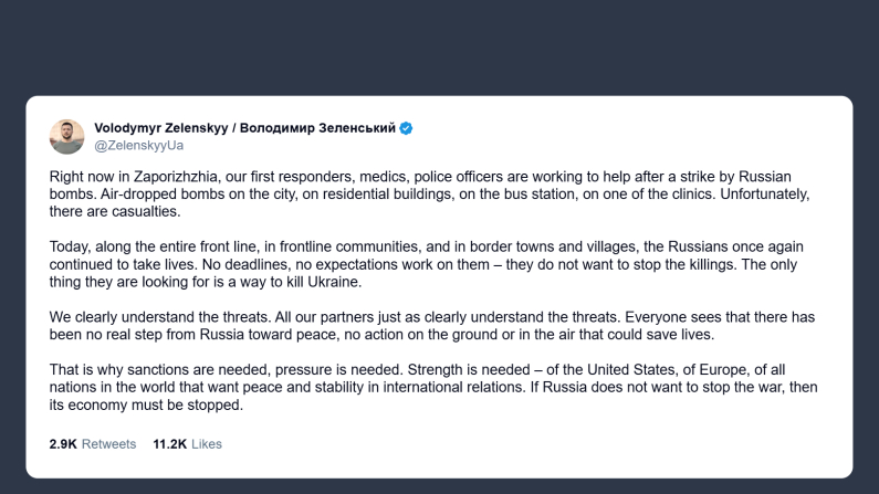 Zelensky: attacco a Zaporizhzhia Necessarie ulteriori sanzioni contro Mosca