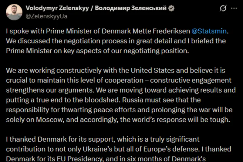 Il presidente ucraino Volodymyr Zelensky ha scritto su X: «Ho parlato con il primo ministro danese Mette Frederiksen. Abbiamo discusso il processo negoziale in modo molto dettagliato e ho informato il primo ministro sugli aspetti chiave della nostra posizione negoziale. Stiamo lavorando in modo costruttivo con gli Stati Uniti e crediamo che sia fondamentale mantenere questo livello di cooperazione, un impegno costruttivo rafforza le nostre argomentazioni. Ci stiamo muovendo verso il raggiungimento di risultati e la vera fine dello spargimento di sangue. La Russia deve rendersi conto che la responsabilità di ostacolare gli sforzi di pace e prolungare la guerra ricadrà esclusivamente su Mosca e, di conseguenza, la risposta mondiale sarà dura. Ho ringraziato la Danimarca per il suo sostegno, che rappresenta un contributo davvero significativo non solo alla difesa dell’Ucraina, ma di tutta l’Europa. Ho ringraziato la Danimarca per la sua presidenza dell’Ue e, nei sei mesi di presidenza danese, sono stati compiuti passi molto significativi, tra cui la decisione di una garanzia di sicurezza finanziaria di 90 miliardi di euro per l’Ucraina. L’Europa si rafforza con ogni passo che facciamo insieme. Abbiamo concordato di continuare a collaborare strettamente, e sarà davvero prezioso, per progredire verso l’effettiva attuazione delle garanzie di sicurezza, sia nel nostro lavoro bilaterale con gli Stati Uniti, sia con i nostri partner in tutta Europa. Grazie, Mette».