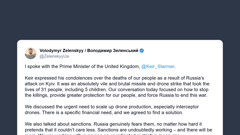 Il presidente ucraino Volodymyr Zelensky ha annunciato su X di aver avuto un colloquio con il primo ministro britannico Keir Starmer, che ha espresso condoglianze per le 31 vittime, tra cui 5 bambini, dell’attacco russo su Kiev. La discussione tra Kiev e Londra si è concentrata su come «fermare le uccisioni, proteggere il popolo ucraino e costringere la Russia a porre fine alla guerra». Tra le misure da adottare urge l’incremento della produzione di droni, in particolare quelli intercettori, e l’inasprimento delle «sanzioni da imporre alla Russia» che, dice Zelensky, sono piuttosto temute da Mosca nonostante «finga indifferenza». Inoltre, hanno affrontato la cooperazione con gli Stati Uniti e hanno allineato le posizioni in vista di prossimi eventi internazionali, preparando un’intensa attività diplomatica con partner europei e americani.