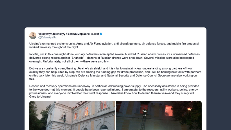 Il presidente ucraino Volodymyr Zelensky ha pubblicato un post su X lodando le forze di difesa aerea ucraine, che nella notte hanno intercettato centinaia di droni d’attacco russi, e diversi missili. «Purtroppo non tutti gli obiettivi sono stati neutralizzati», ha scritto, segnalando 8 feriti.