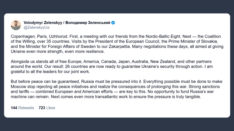Il presidente ucraino Volodymyr Zelensky, ha ricordato su X gli incontri con diversi Paesi per discutere della pace in Ucraina come quelli a Copenaghen, Parigi, Uzhhorod e il vertice della Coalizione dei Volenterosi, con oltre 35 nazioni. I molti negoziati in questi giorni, sono tutti, dice Zelensky, serviti a rafforzare l’Ucraina rendendola ancora più resiliente. «Al nostro fianco ci sono tutta l’Europa libera, gli Stati Uniti, il Canada, il Giappone, l’Australia, la Nuova Zelanda e altri partner nel mondo. Il nostro risultato: 26 Paesi vogliono garantire la sicurezza dell’Ucraina con azioni concrete». Ma prima che la pace possa essere garantita la Russia «deve essere costretta» a negoziarla. Bisogna fare tutto il «possibile» affinché Mosca smetta di «respingere» le iniziative di pace. Questo, per il presidente ucraino, può essere fatto soltanto attraverso le sanzioni e i dazi, insieme agli «sforzi congiunti di Europa e Stati Uniti», considerati «fondamentali».