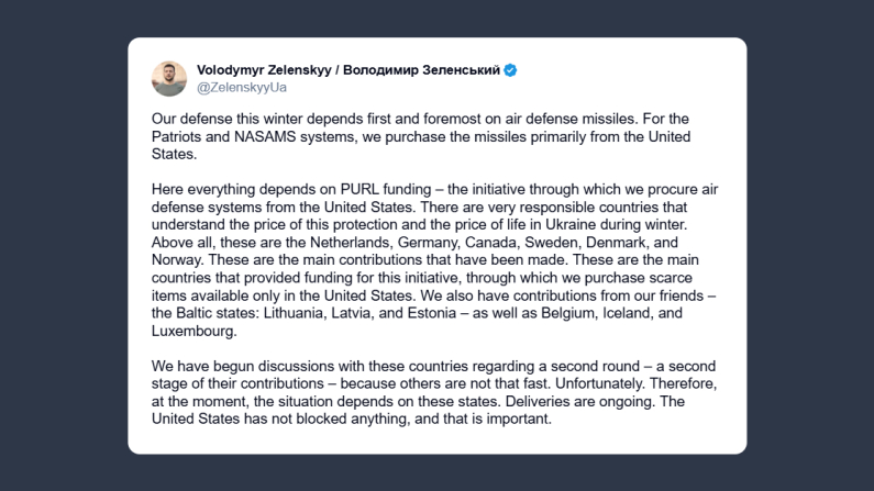 «La nostra difesa per l’inverno dipende innanzitutto dai missili per la difesa aerea. Per i sistemi Patriot e Nasams, acquistiamo i missili principalmente dagli Stati Uniti. Tutto dipende dai fondi dell’iniziativa Purl, attraverso la quale procuriamo sistemi di difesa aerea dagli Stati Uniti. Ci sono Paesi molto responsabili che comprendono il valore di questa protezione e l’importanza della vita in Ucraina durante l’inverno. In particolare, si tratta di Paesi Bassi, Germania, Canada, Svezia, Danimarca e Norvegia, che hanno fornito i contributi principali. Sono loro i Paesi che hanno finanziato maggiormente questa iniziativa, permettendoci di acquistare materiali rari disponibili solo negli Stati Uniti. Abbiamo ricevuto contributi anche dai nostri amici: gli Stati baltici – Lituania, Lettonia ed Estonia – oltre a Belgio, Islanda e Lussemburgo. Abbiamo avviato discussioni con questi paesi per una seconda fase di finanziamenti, perché altri non stanno agendo con la stessa rapidità. Purtroppo. Al momento, quindi, la situazione dipende da questi Stati. Le consegne sono in corso. Gli Stati Uniti non hanno bloccato nulla, e questo è fondamentale».