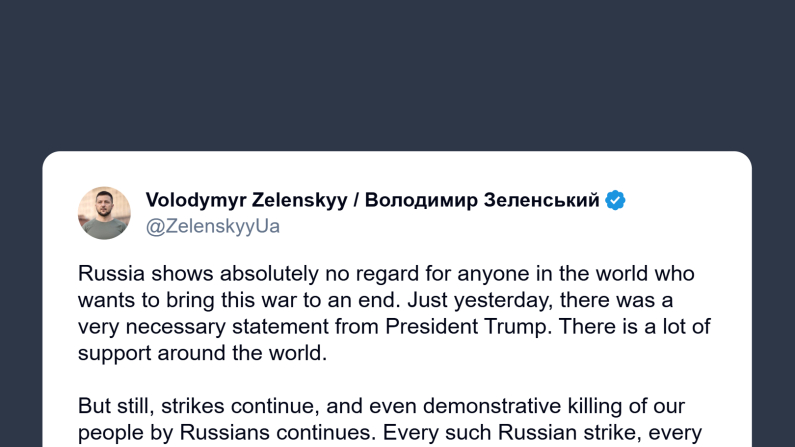 Il presidente ucraino Volodymyr Zelensky ha pubblicato un post su X denunciando l’indifferenza della Russia verso gli sforzi mondiali per porre fine alla guerra. Citando una recente dichiarazione del presidente americano Donald Trump e il sostegno internazionale, il presidente ucraino ha sottolineato che gli attacchi russi continuano, definendoli «dimostrativi». Ogni attacco russo, dice Zelensky, in risposta agli «appelli mondiali per fermare la guerra», dimostra che la pressione contro Mosca «è necessaria», ha scritto, invocando nuove sanzioni contro la Russia, un sostegno costante all’Ucraina e una diplomazia coordinata per la pace.