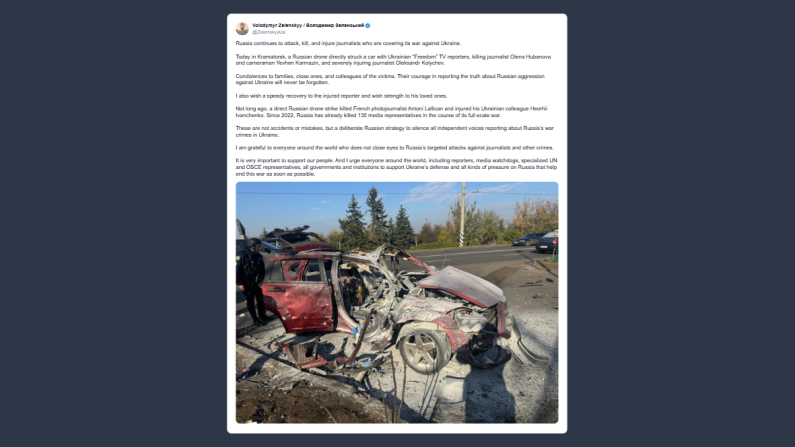 Il presidente ucraino Volodymyr Zelensky oggi ha scritto su X: «La Russia continua ad attaccare, uccidere e ferire i giornalisti che documentano la guerra in Ucraina. Oggi a Kramatorsk, un drone russo ha colpito direttamente un’auto con i reporter della televisione ucraina Freedom, uccidendo la giornalista Olena Hubanova e il cameraman Yevhen Karmazin, e ferendo gravemente il giornalista Oleksandr Kolychev […] Dal 2022, la Russia ha già ucciso 135 giornalisti. Questi non sono incidenti o errori, ma una strategia deliberata della Russia per mettere a tacere tutte le voci indipendenti che denunciano i crimini di guerra russi in Ucraina».