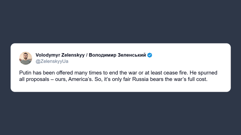 «A Vladimir Putin è stato proposto più volte di porre fine alla guerra o almeno di accettare un cessate il fuoco. Ha respinto tutte le proposte, sia le nostre sia quelle degli Stati Uniti. È quindi giusto che la Russia sostenga interamente i costi della guerra».
