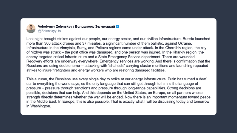 «Questo autunno, i russi attaccano ogni singolo giorno le nostre infrastrutture energetiche. Putin si è chiuso a ogni messaggio del mondo, quindi l’unico linguaggio che può comprendere è quello della forza: pressione attraverso sanzioni e tramite capacità a lungo raggio». Per il presidente ucraino tutto questo «dipende dagli Stati Uniti, dall’Europa e da tutti i Paesi alleati […] ora c’è un importante slancio verso la pace in Medio Oriente. Anche in Europa, la pace è possibile, ed è esattamente ciò di cui discuterò oggi e domani a Washington».