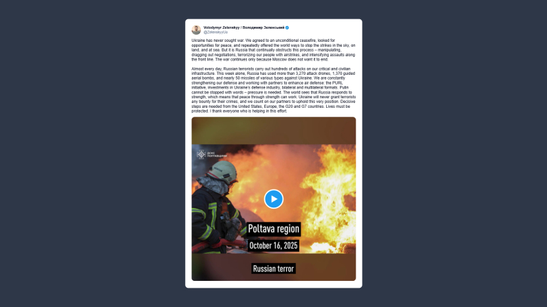 Quasi ogni giorno, dice Zelenksy, i «terroristi russi lanciano centinaia di attacchi contro le infrastrutture civili [ucraine ndr]. Solo questa settimana, la Russia ha impiegato oltre 3 mila 270 droni d’attacco, 1.370 bombe e quasi 50 missili di vario tipo. Stiamo rafforzando di continuo la nostra difesa […] Putin non si ferma con le parole: serve pressione. Il mondo vede che la Russia risponde alla forza, il che significa che la pace attraverso la forza può funzionare». L’Ucraina, conclude il presidente, «non concederà mai ai terroristi alcun premio per i loro crimini. Gli Stati Uniti, l’Europa, i Paesi del G20 e del G7 devono compiere passi decisi».