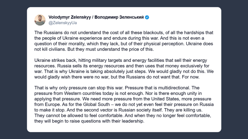 «I russi non comprendono il costo dei blackout, delle sofferenze che il popolo ucraino affronta e sopporta durante questa guerra. Non è nemmeno una questione di moralità, che a loro manca, ma di percezione fisica. L’Ucraina non colpisce i civili. Ma i russi devono capire il prezzo di tutto questo. L’Ucraina risponde, colpendo obiettivi militari e infrastrutture energetiche che producono guadagni per Mosca. La Russia vende le sue risorse energetiche e utilizza quei fondi esclusivamente per finanziare la guerra».