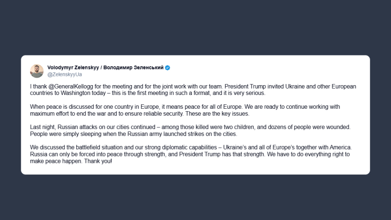 Il presidente ucraino Volodymyr Zelensky ha scritto in un post su X: «il presidente Donald Trump ha invitato oggi l’Ucraina e altri Paesi europei a Washington: è il primo incontro di questa portata, ed è davvero importante». Zelensky ha sottolineato che si lavorerà con il massimo impegno per «porre fine» alla guerra, nonostante gli «attacchi russi di ieri notte», che hanno causato la morte di due bambini e decine feriti. La Russia, dice Zelensky, può essere «costretta alla pace solo con la forza, e il presidente Trump ha questa forza».
