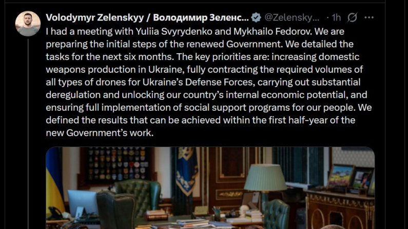 Il presidente ucraino Volodymyr Zelensky ha annunciato su X un incontro con la prima vicepremier Yuliia Svyrydenko e il ministro Mykhailo Fedorov per pianificare le attività del rinnovato governo ucraino: «Ho avuto un incontro con Yuliia Svyrydenko e Mykhailo Fedorov. Stiamo preparando i primi passi del nuovo governo. Abbiamo dettagliato i compiti per i prossimi sei mesi». Le priorità includerebbero: «Aumentare la produzione interna di armi in Ucraina, contrattare pienamente i volumi richiesti di tutti i tipi di droni per le Forze armate ucraine, realizzare una sostanziale deregolamentazione e sbloccare il potenziale economico interno del nostro Paese, e garantire la piena attuazione dei programmi di supporto sociale per il nostro popolo». Zelensky ha concluso: «Abbiamo definito i risultati che possono essere raggiunti nella prima metà dell’anno di lavoro del nuovo governo».