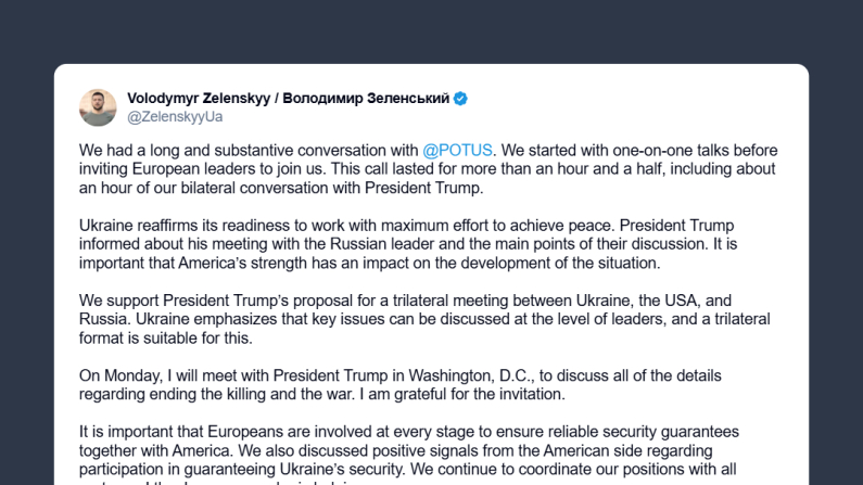 Il presidente ucraino ha poi annunciato un prossimo «incontro con Trump a Washington D.C.» previsto per lunedì, al fine di discutere i dettagli sul come «porre fine alla guerra».