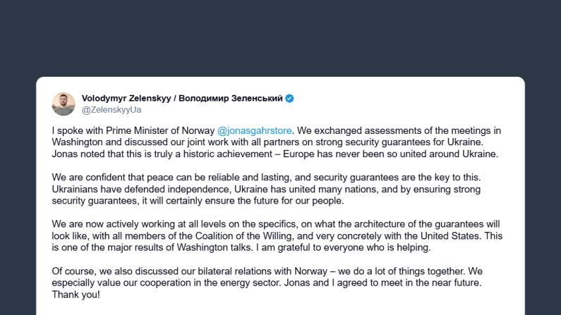 Il presidente ucraino Volodymyr Zelensky ha annunciato ieri su X di aver condiviso con il Primo Ministro della Norvegia, Jonas Gahr Støre, le valutazioni sugli incontri a Washington e sulle “garanzie di sicurezza” per l’Ucraina. Jonas ha poi sottolineato il risultato storico: «l’Europa non è mai stata così unita intorno all’Ucraina. Siamo fiduciosi che si possa arrivare a una pace duratura, e per questo le garanzie di sicurezza sono la chiave».