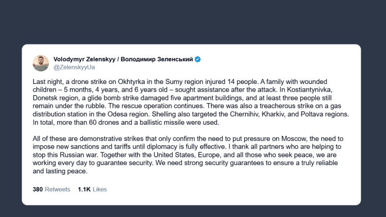 Tutti questi attacchi confermano la «necessità di esercitare ulteriore pressione su Mosca», con nuove sanzioni e dazi. «Insieme agli Stati Uniti, all’Europa e a tutti coloro che cercano la pace, lavoriamo ogni giorno per garantire la sicurezza». Il presidente ucraino ribadisce che servono solide «garanzie di sicurezza» per assicurare una pace duratura.
