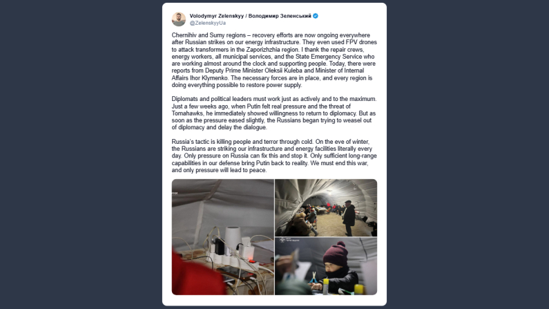 «Le forze necessarie sono dispiegate, e ogni regione sta facendo il possibile per ripristinare l’approvvigionamento elettrico. Anche i diplomatici e i leader politici devono lavorare con la stessa intensità e al massimo delle loro capacità. Solo poche settimane fa, quando Putin ha percepito una pressione reale e la minaccia dei Tomahawk, ha subito mostrato disponibilità a tornare alla diplomazia. Ma non appena la pressione si è allentata, i russi hanno iniziato a sottrarsi al dialogo e a procrastinarlo. La tattica della Russia consiste nell’uccidere e seminare il terrore per il freddo. Alla vigilia dell’inverno, i russi colpiscono quotidianamente le nostre infrastrutture e gli impianti energetici. Solo la pressione sulla Russia può risolvere questa situazione e fermarla. Solo capacità difensive a lungo raggio sufficienti possono riportare Putin alla realtà. Dobbiamo porre fine a questa guerra, e solo la pressione condurrà alla pace».