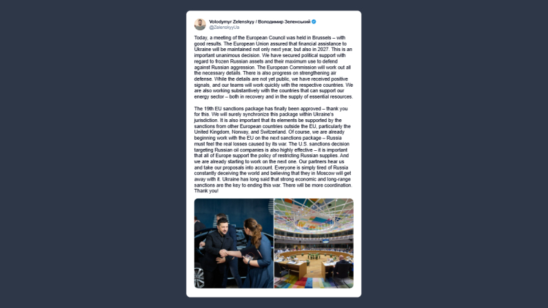 Zelensky ha poi precisato che «stiamo inoltre collaborando attivamente con le nazioni in grado di supportare il nostro settore energetico, sia per la ripresa sia per la fornitura di risorse essenziali. È stato finalmente approvato il diciannovesimo pacchetto di sanzioni dell’Ue […] È altrettanto importante che le sue misure siano sostenute dalle sanzioni di altri Paesi europei al di fuori dell’Ue, in particolare Regno Unito, Norvegia e Svizzera».