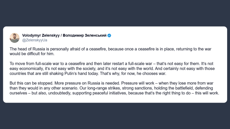 Il presidente ucraino Volodymyr Zelensky ha scritto ieri su X: «il presidente russo teme personalmente un cessate il fuoco, perché una volta instaurato, riprendere la guerra gli risulterebbe arduo». Per il presidente ucraino passare da una «guerra su larga scala a un cessate il fuoco e poi riavviare un conflitto su vasta scala non è semplice per i russi: non lo è dal punto di vista economico, per la società, per la comunità internazionale, e certamente non lo è per quei Paesi che oggi stringono ancora la mano a Vladimir Putin».