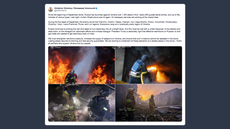 Il presidente ucraino Volodymyr Zelensky, ha comunicato in post su X che la Russia, dall’inizio di settembre, ha lanciato contro l’Ucraina oltre 1.300 attacchi con i droni, 900 bombe aeree guidate e fino a cinquanta missili di vario tipo. «Nella prima settimana di settembre, il nemico ha colpito le regioni di Chernihiv, Kharkiv, Odesa, Kherson, Kiev, Zaporizhzhia, Dnipro, Kirovohrad, Khmelnytskyi, Zhytomyr, Volyn, Ivano-Frankivsk, Rivne e Lviv». Mosca, dice Zelensky, continua a «protrarre» la guerra cercando di trasformare la diplomazia in una farsa. Il presidente Donald Trump, quindi, ha «assolutamente ragione nel sostenere che servono restrizioni efficaci al commercio di petrolio e gas russo per riportare la diplomazia sulla giusta strada». Vanno intensificate le sanzioni, bisogna aumentare la fornitura di armi all’Ucraina e garantire che «invasioni come questa non si ripetano in futuro».