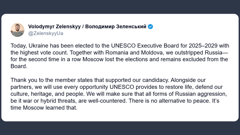 Il presidente ucraino, Volodymyr Zelensky, ha scritto su X: «oggi l’Ucraina è stata eletta nel Consiglio esecutivo dell’Unesco per il periodo 2025-2029 con il maggior numero di voti. Insieme a Romania e Moldavia abbiamo superato la Russia, per la seconda volta consecutiva Mosca ha perso le elezioni e resta esclusa dal Consiglio. Grazie agli Stati membri che hanno sostenuto la nostra candidatura. Insieme agli alleati sfrutteremo ogni opportunità offerta dall’Unesco per ricostruire la vita, difendere la nostra cultura, il patrimonio e il nostro popolo. Faremo in modo che ogni forma di aggressione russa, guerra o minacce ibride, venga efficacemente contrastata. Non esiste alternativa alla pace. È ora che Mosca lo impari».