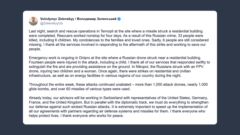 Il presidente ucraino, Volodymyr Zelensky, ha scritto su X: «Ieri notte si sono concluse le operazioni di ricerca e soccorso a Ternopil, dove un missile ha colpito un edificio residenziale. A causa di questo crimine russo hanno perso la vita 33 persone, tra cui 6 bambini [e altre 6 persone ndr] risultano ancora disperse». A Dnipro, continua il presidente ucraino, un attacco russo «ha ferito 14 persone, tra cui un bambino. […] A Nikopol i russi hanno colpito con un drone Fpv, ferendo due bambini e una donna. Ancora una volta, nella notte, sono stati presi di mira edifici residenziali, infrastrutture civili e impianti energetici in diverse regioni del Paese. Per tutta la settimana gli attacchi non si sono mai fermati: oltre 1.050 droni d’attacco, quasi mille bombe plananti e più di 60 missili di vario tipo. Già oggi i nostri consiglieri saranno in Svizzera con i rappresentanti di Stati Uniti, Germania, Francia e Regno Unito. Ma parallelamente alla strada diplomatica – conclude Zelensky – dobbiamo fare di tutto per rafforzare la difesa contro questi attacchi russi perversi. È fondamentale accelerare l’attuazione di tutti gli accordi con i partner su sistemi di difesa aerea e missili».