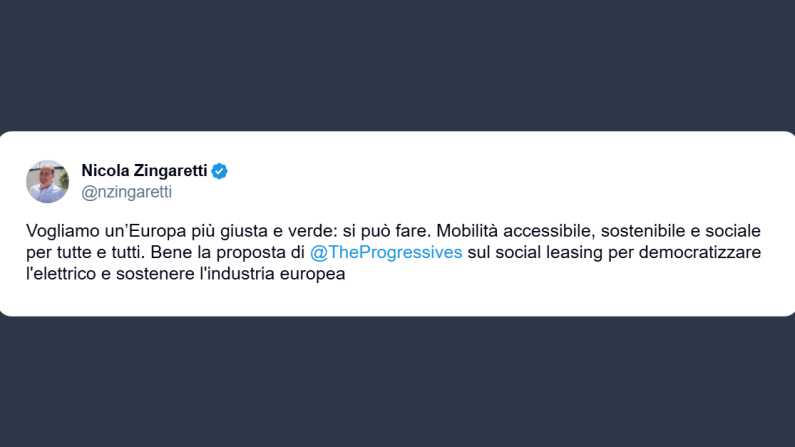 «Vogliamo un’Europa più giusta e verde: si può fare. Mobilità accessibile, sostenibile e sociale per tutte e tutti. Bene la proposta del Gruppo Socialisti e Democratici (S&D) sul social leasing per democratizzare l’elettrico e sostenere l’industria europea».